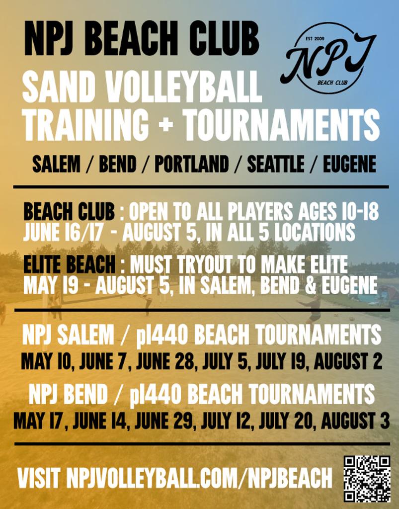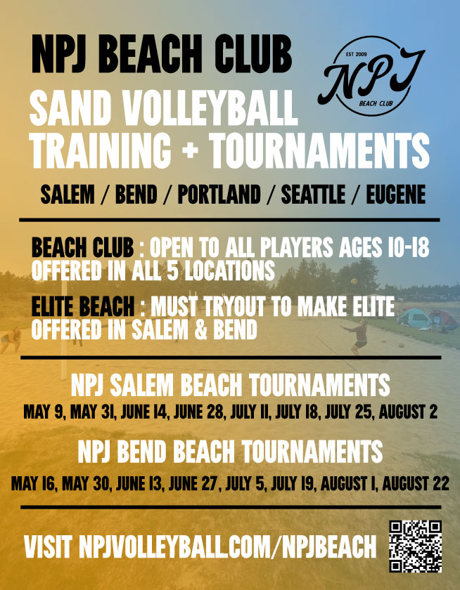 NPJ also hosts p1440, AVP & CEVA Region affiliated Beach Tournaments in Bend & Salem!